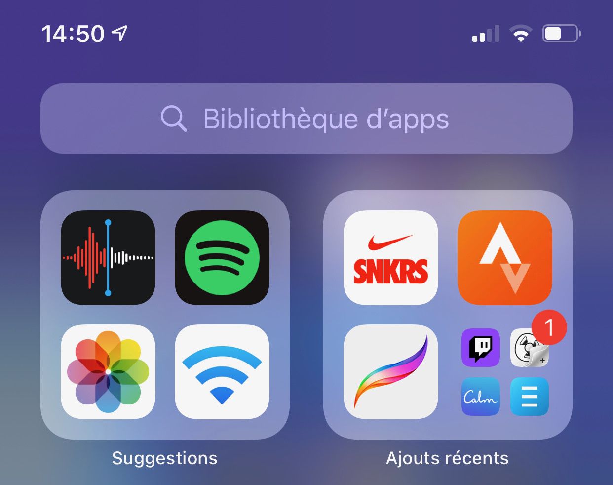 Dans la vue générale de la Bibliothèque des apps, vous ne pouvez pas not plus déplacer les dossiers entre eux. Par contre, iOS peut jouer à l'ascenseur et faire remonter des dossiers aux dépens d'autres, due south'il estime qu'ils contiennent des apps dont vous allez avoir besoin à un moment particulier de la journée.