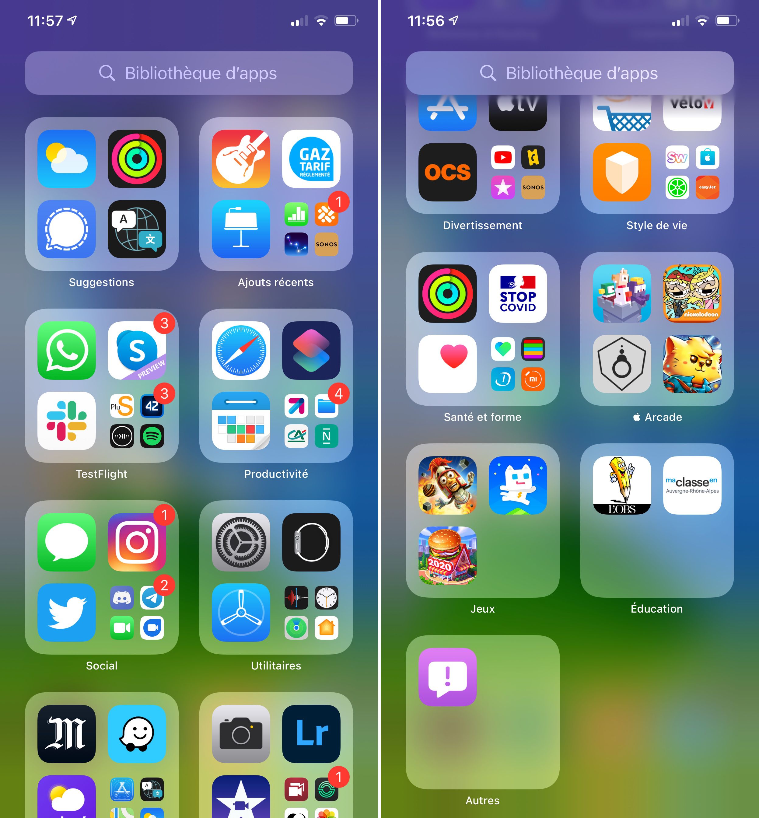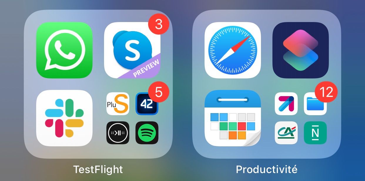 Mais si vous observez la vue réduite de ces dossiers, vous verrez que des apps qui sont en toute fin de liste à l'intérieur, apparaissent pourtant de manière proéminente à fifty'extérieur : exemple avec « WhatsApp », « Skype » et « Slack » à gauche. C'est iOS qui choisit de mettre en avant les apps les plus à même de vous intéresser ou récemment utilisées.