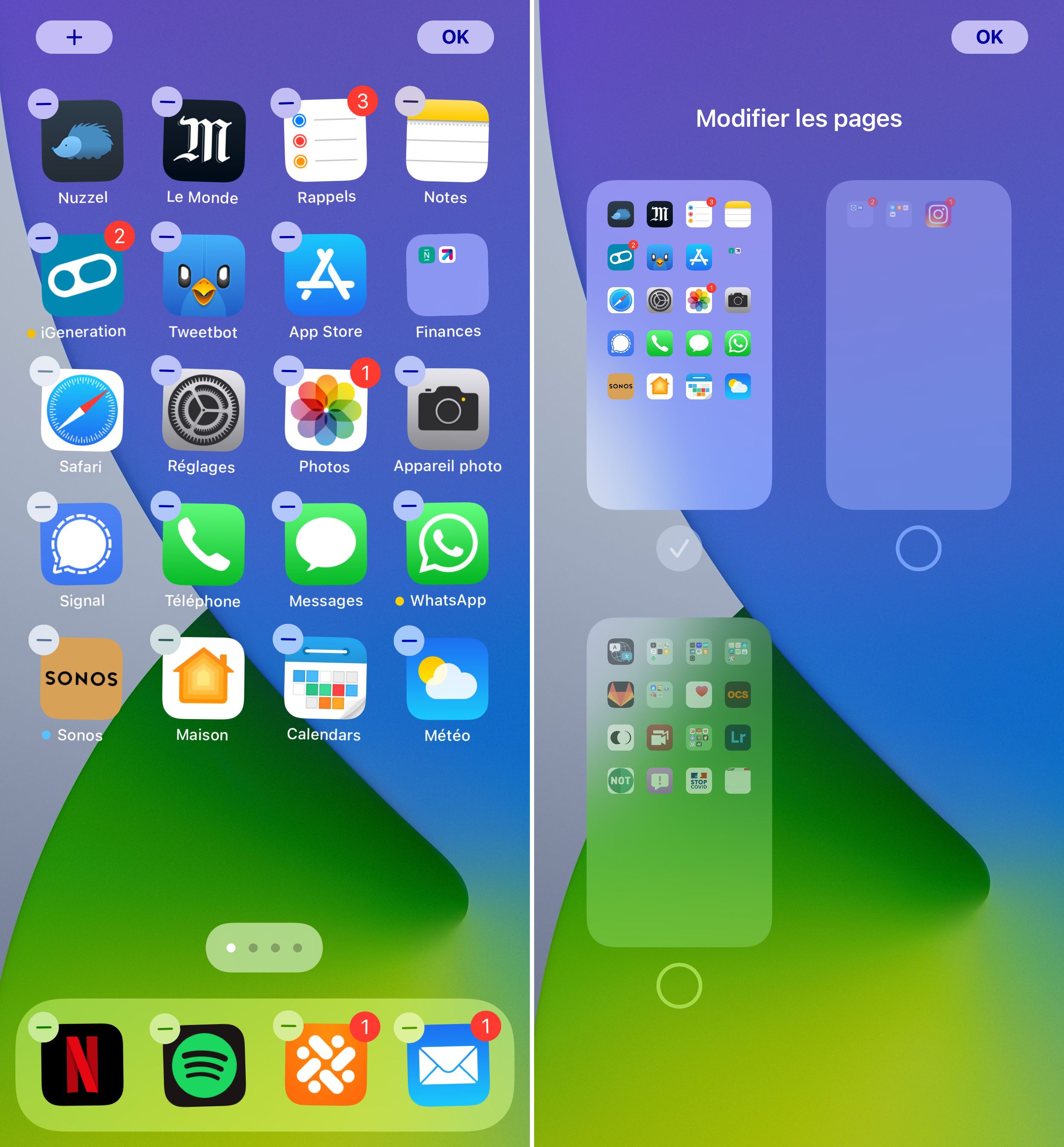 La « Bibliothèque d'apps » s'apparente au dossier « Applications » sur Mac et les apps que vous souhaitez garder sur fifty'écran d'accueil en seraient leurs alias. Cascade obtenir l'affichage de la Bibliothèque d'apps, commencez par activer le mode « Modification de fifty'écran d'accueil » par une pression prolongée sur une icône ou sur un endroit vierge de l'écran d'accueil, et touchez l'indicateur du nombre de pages qui surplombe le Dock.