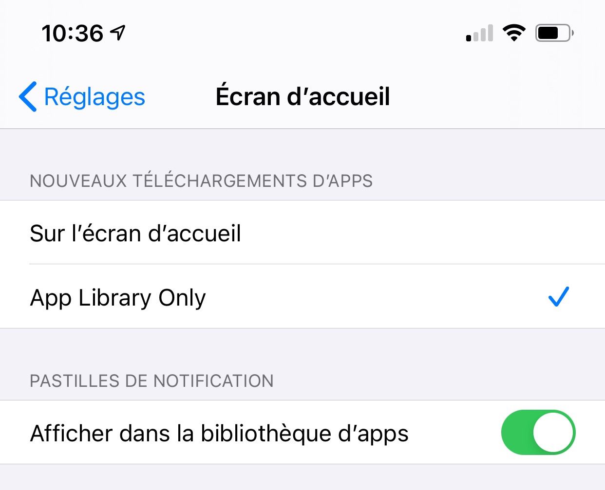 À ce propos, dans les réglages « Écran d'accueil » d'iOS, on peut choisir que les apps téléchargées arrivent directement dans les dossiers de la Bibliothèque d'apps ou qu'elles apparaissent sur votre folio d'accueil (et si la identify manque, une nouvelle page sera créée). C'est à cet endroit des réglages aussi que l'on peut choisir de masquer les pastilles des notifications pour éviter l'effet guirlande de Noël.